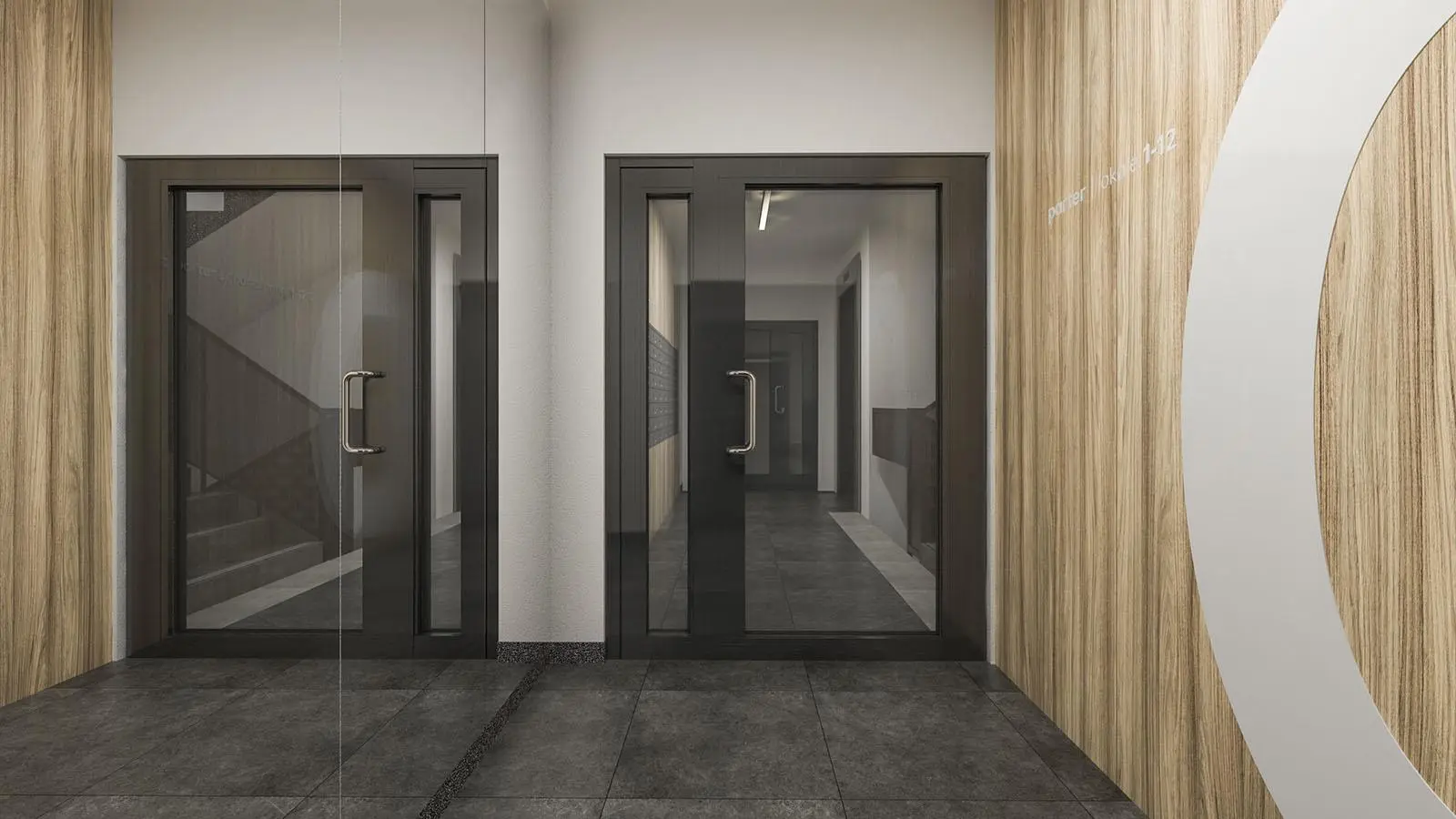 Przestrzeń klatek schodowych i części wspólnych harmonijnie zaaranżowano przy wykorzystaniu trwałych gresów o delikatnym i stonowanym designie, laminowanych paneli meblowych w naturalnym, złotym kolorze oraz szlachetnego i wysokiej jakości tynku mozaikowego. W holu wejściowym zaprojektowano ponadto duże lustro i estetyczne skrzynki pocztowe.