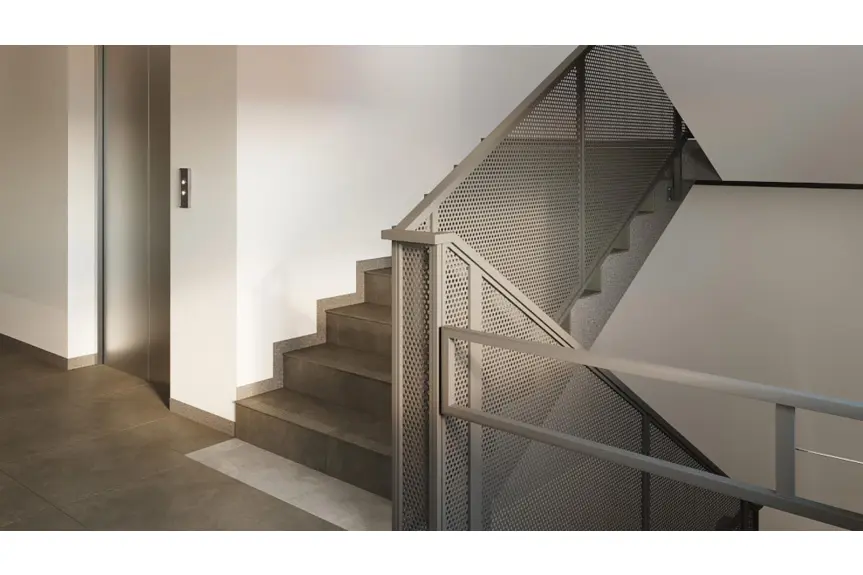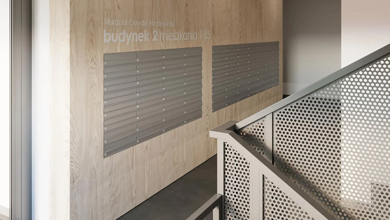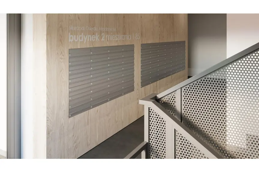 W przestrzeni klatek schodowych i części wspólnych zastosowano trwałe gresy o delikatnym, stonowanym wzornictwie, laminowane panele ścienne w naturalnym, złotym kolorze oraz wysokogatunkowy tynk mozaikowy, tworząc harmonijną kompozycję. W holu wejściowym umieszczono duże lustro i estetyczne skrzynki pocztowe, nadając tym pomieszczeniom elegancji i wyrafinowania.