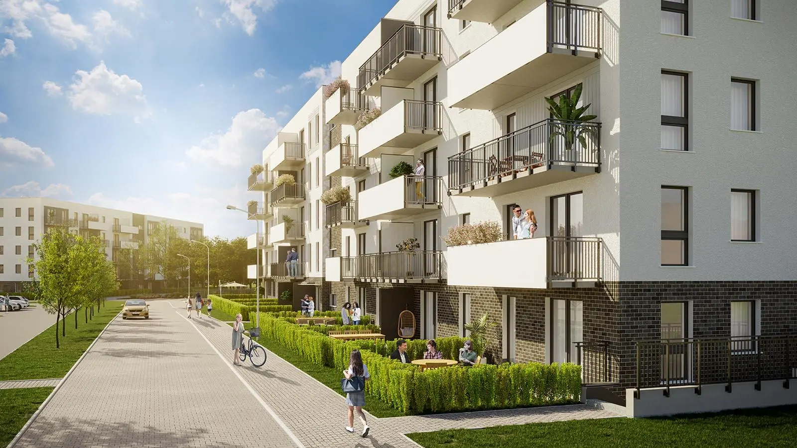Mieszkania na parterze mają dodatkową powierzchnię w postaci zielonych ogródków oraz tarasów wybrukowanych kostką.